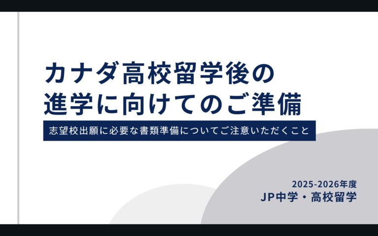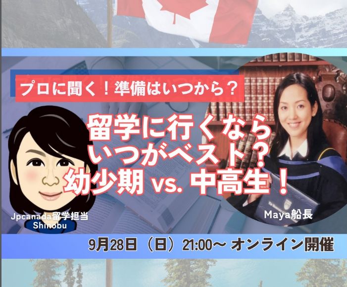 親子留学・高校留学・進学に関するセミナーおよび個別相談会 投稿日 2025年9月23日 カテゴリー Blog 日頃カナダで高校生のサポートを行っているマネージャーの松丸しのぶが日本へまいりまして、親子留学・高校留学・進学に関するセミナーおよび個別相談会を実施いたします。 詳細はこちらをご覧ください この投稿をInstagramで見る JPカナダ高校留学(@jpcanada_highschool)がシェアした投稿